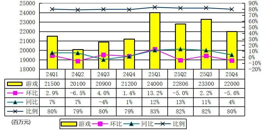 网易2025年第四季度来自游戏及干系升值处事净收入为220亿元(31亿好意思元),较上年同时的212亿元增长4%,较上一季度的233亿元下降5.6%。