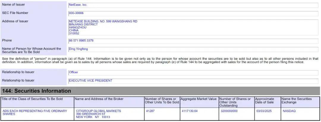 据网易递交给好意思国SEC的文献露出,网易本质副总裁丁迎峰于2025年3月3日减握41287股,套现411.71万好意思元(约3001万元)。